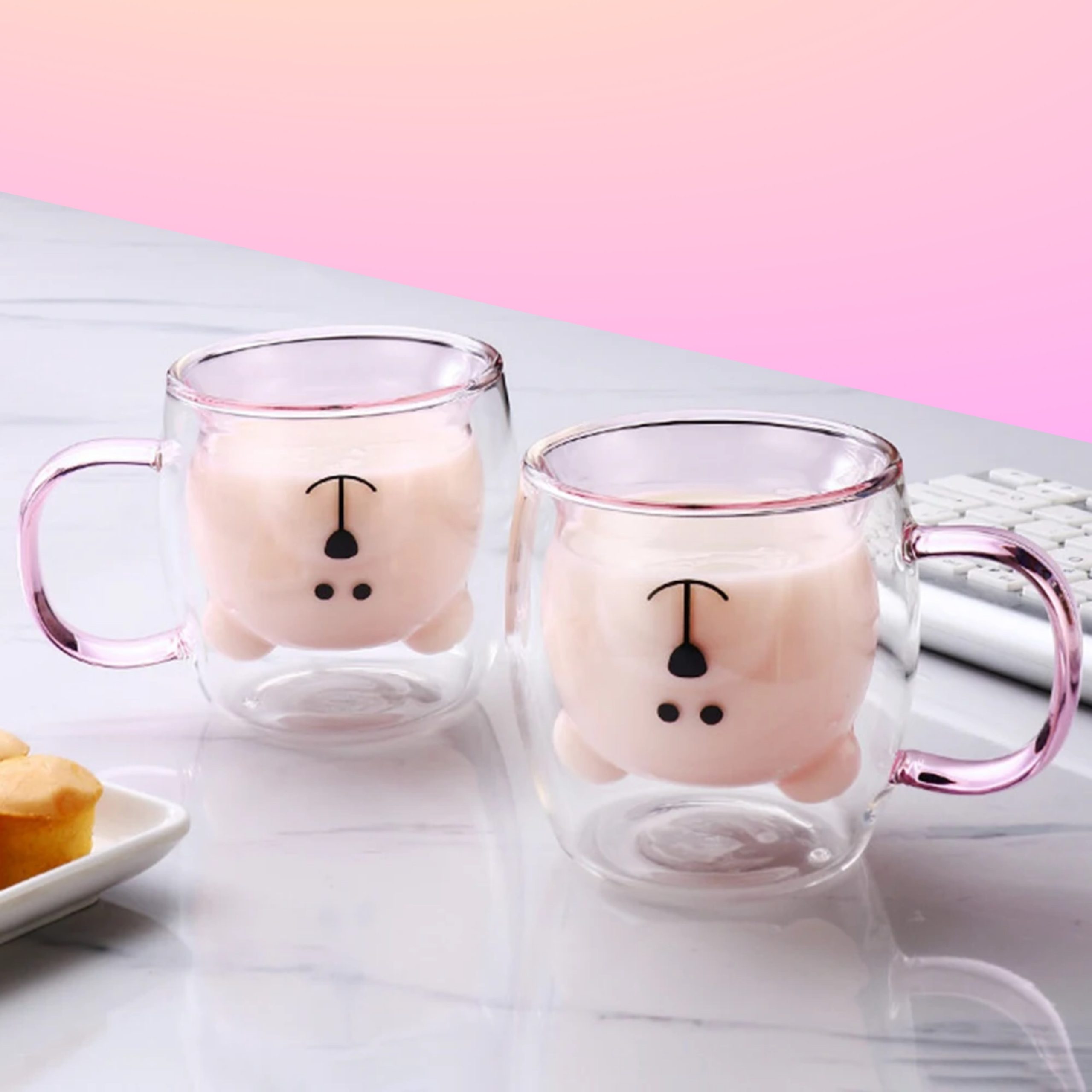 Cute Bear Double Wall High Borosilicate Glass Cup/Mug with Handle – 250 ML (Pink)